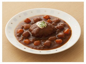 ●原材料/ハンバーグ(国内製造)(鶏肉、ソテーオニオン、でん粉、パン粉、乾燥マッシュポテト、乾燥卵白、食塩、砂糖)/卵殻カルシウム、調味料(アミノ酸)、ソース(野菜(じゃがいも、にんじん、たまねぎ)、ソテーオニオン、トマトペースト、小麦粉、ポーク・チキンエキス、砂糖、植物油脂、ウスターソース、ラード、酵母エキスパウダー、トマトケチャップ、ワイン、食塩、香辛料、ココアパウダー/カラメル色素、増粘剤(加工でん粉)、調味料(アミノ酸等))、(一部に卵・乳成分・小麦・大豆・鶏肉・豚肉を含む) ●栄養成分/(1袋当たり)エネルギー75kcal、たんぱく質3.8g、脂質2.8g、炭水化物9.1g、食塩相当量0.8g ●アレルギー/卵・乳成分・小麦・大豆・鶏肉・豚肉 ●賞味期限/製造後2年1ヶ月 ●ユニバーサルデザインフード/容易にかめる(区分1) ●生産国/日本