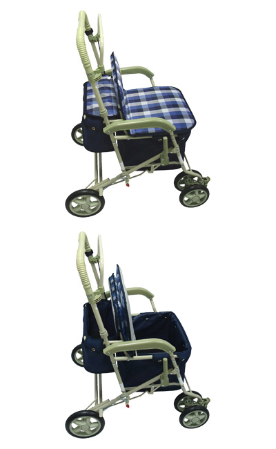 ●サイズ/幅50×奥行66×高さ84〜93(4段階/約3cm)cm、折りたたみ時:奥行24×高さ82cm、座面:幅36×奥行29cm、座面高:約43cm ●車輪サイズ/前輪14.5×後輪17.5cm ●重さ/約7.5kg ●材質/フレーム:スチール、バッグ:ポリエステル ●バッグ容量/20L ●積載荷重/10kg ●最大使用者体重/100kg ●標準機能/折りたたみ(自立不可)、2WAYキャスター(左右60°・固定)、手元ブレーキ、駐車ブレーキ、座面、杖・傘立て ●生産国/ベトナム ●SGマーク取得商品