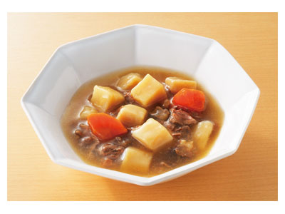 ●原材料/野菜(じゃがいも(国産)、たまねぎ、にんじん)、牛肉、しょうゆ、砂糖、米発酵調味料、植物油脂、かつお節エキス、ソテーオニオン、ポーク・チキンエキス、こんぶエキスパウダー/増粘剤(加工でん粉、キサンタンガム)、調味料(アミノ酸等)、(一部に小麦・牛肉・大豆・鶏肉・豚肉を含む) ●栄養成分/(1袋当たり)エネルギー64kcal、たんぱく質2.6g、脂質1.5g、炭水化物9.9g、食塩相当量0.8g ●アレルギー/小麦・牛肉・大豆・鶏肉・豚肉 ●賞味期限/製造後2年1ヶ月 ●ユニバーサルデザインフード/容易にかめる(区分1) ●生産国/日本