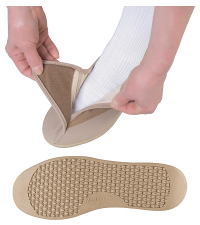 ・足にやさしい5つのポイント:体重移動をコントロールして歩行をサポート、水に浮くほど軽い、つまずきにくく安心、脱ぎ履きが簡単、安心・安全な国内生産。
