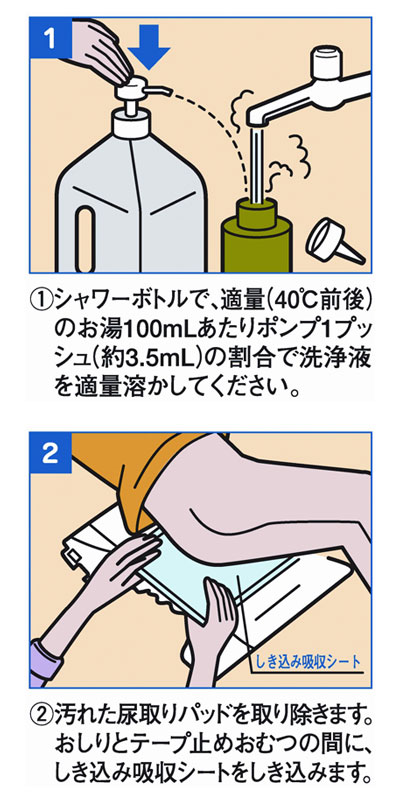 ・すすぎのいらない簡単ケア。シャワーボトルに、適温(40℃前後)のお湯あたり300mLあたり洗浄液ポンプ1プッシュ(約3.5mL)を希釈してください。