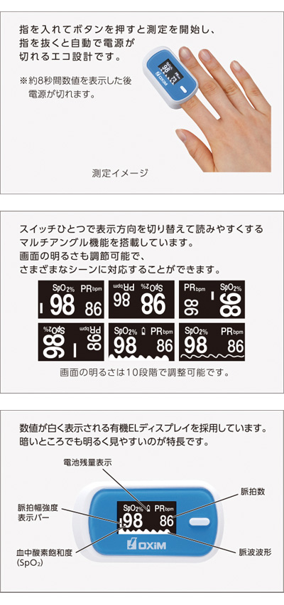 ●測定範囲/SpO2:70〜100%、脈拍数:30〜250bpm