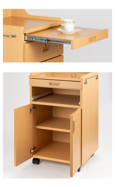 ・引出しはシリンダー錠付きで貴重品の管理も安心。食事用スライドトレーは3段式レールで奥までしっかり引き出せます。