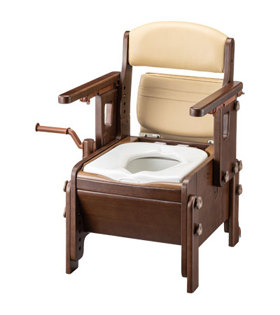 ●サイズ/幅52×奥行57.5×高さ81〜93cm、座面:幅36×奥行40cm、穴部:幅19×奥行29cm、便座高:38〜50cm(5段階)、ひじ掛け高:18〜27cm(4段階)、ひじ掛け内寸:42cm ●重さ/16.8kg ●材質/天然木(ラバーウッド)、ウレタン樹脂塗装、合成皮革、ウレタンフォーム、ポリプロピレン ●最大使用者体重/100kg ●標準機能/ひじ掛け跳ね上げ、ひじ掛け高さ調整、キャスター付、オイルダンパー、防汚トレイ ●生産国/日本(木部:ベトナム) ●完成品