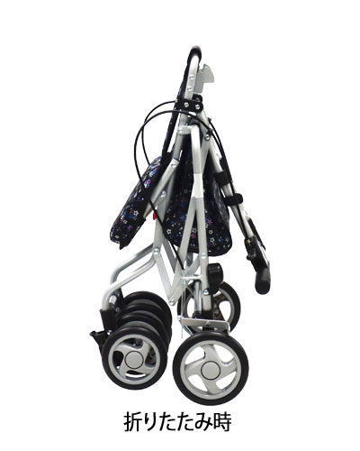 ●サイズ/幅43×奥行53.5×高さ86.5〜94.5(3段階/4cm)cm、折りたたみ時:奥行35×高さ68cm、座面:幅25×奥行18cm、座面高:46cm ●車輪サイズ/前輪13×後輪14.5cm ●重さ/4.5kg ●材質/フレーム:アルミパイプ(粉体塗装)、バッグ:ポリエステル ●バッグ容量/約4L ●積載荷重/2kg ●最大使用者体重/80kg ●標準機能/折りたたみ、2WAYキャスター(左右60°、固定)、手元ブレーキ、駐車ブレーキ、座面、杖・傘立て ●生産国/ベトナム ●SGマーク取得商品
