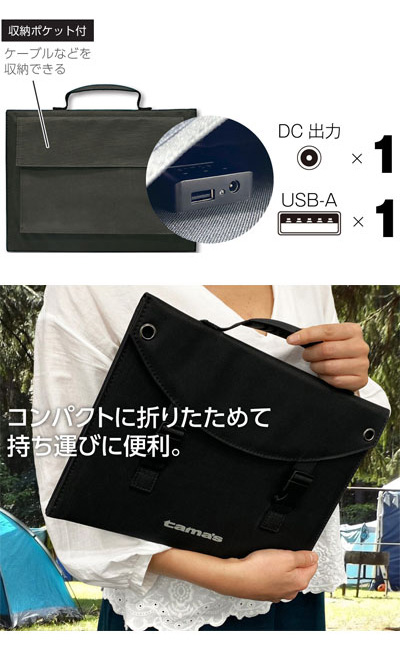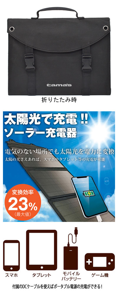 ・太陽光でスマホ等を充電。付属のDCケーブルを使えばポータブル電源も充電可能(※多摩電子工業製TL107G/TL108OR専用)。