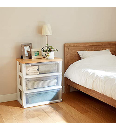 ・木製天板付きのシンプルな多段収納ケースです。引出しストッパー付きで安心してお使いいただけます。