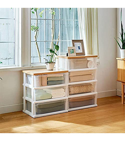 ・木製天板付きのシンプルな多段収納ケースです。引出しストッパー付きで安心してお使いいただけます。