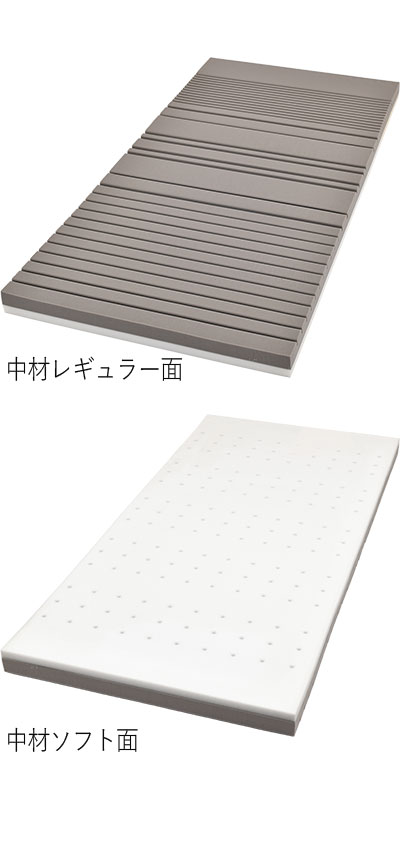・マットレス本体は二層構造でソフト面とハード面の2種類でリバーシブルタイプになり、お好みでお使いいただけます。またレギュラー面はスリット幅を工夫し、電動ベッドにもフィットします。またソフト面ハード面とも程よい通気性のある加工をしています。