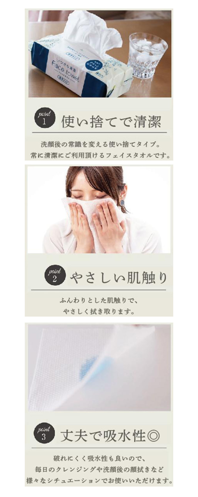 ・お手拭きにはもちろん、毎日のクレンジングや洗顔後の顔拭きに。破れにくく、衛生的な使い捨てタオル!