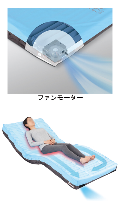 ●サイズ/幅90×長さ192×厚さ12cm ●重さ/8.1kg ●材質/エアセル:ポリウレタンフィルム表面シボ加工、ベースマット:三次元スプリング構造体ブレスエアー、ベースシート:ナイロンオックス・ポリエステルメッシュ・PVCラミネート加工布、ヘッドアップセンサユニット・ファンユニット(ケース部):ABS樹脂、カバー:ポリウレタンフィルムラミネート加工布 ●電源/AC100V ●消費電力/8W ●最大使用者体重/140kg ●セット内容/専用マットレス、専用ポンプ ●生産国/日本 ●制菌加工、防水加工、伸縮加工 ★別売替カバー:有り