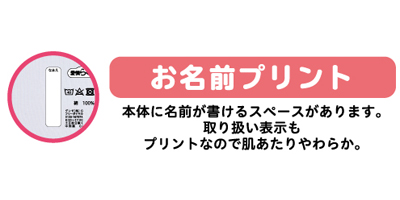 ・お名前プリント。本体に名前が書けるスペースがあります。取り扱い表示もプリントなので肌あたりやわらか。
