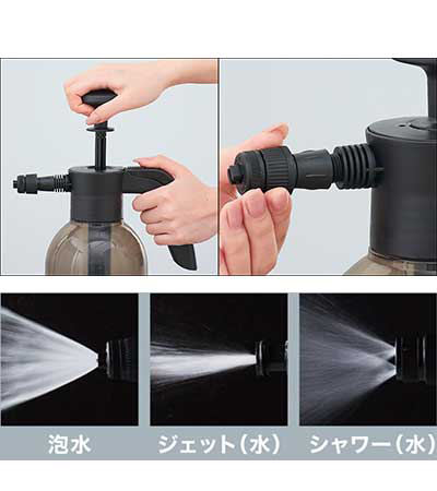 ・3種のノズルを使い分け!ノズルの使い分けで3パターン(泡水/ジェット(水)/シャワー(水))の噴射が選べる!車掃除には、泡水で洗ってシャワーで流す。泥汚れなどにはジェットを。