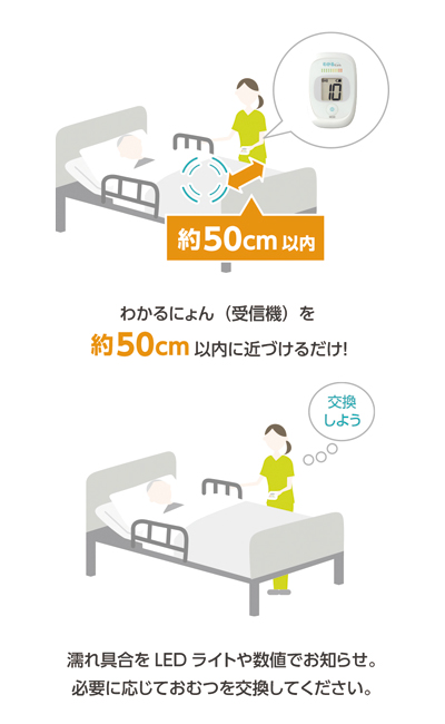 ・ふとんをめくらずに近づくだけで排尿を知ることができます。
