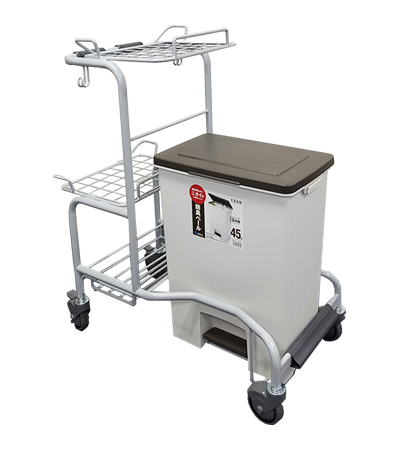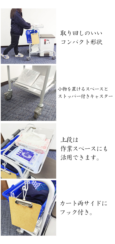 ・おむつ交換や衣類・リネンの交換などの様々な作業に使えるマルチカート。便利に使える買い物カゴ2個付きです。