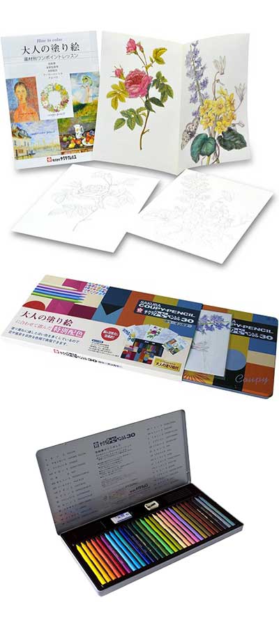 ●セット内容/大人の塗り絵特別配色クーピーペンシル30色(専用消しゴム・削り器付き)、大人の塗り絵2枚(お手本付き)、大人の塗り絵ワンポイントレッスン冊子