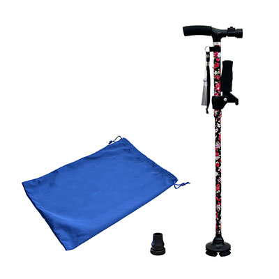 ●サイズ/長さ70〜82cm(5段階/3cm)、グリップ長さ:12.5cm、ベース部:幅8.5×奥行8.5cm ●パイプ径/上部:2.2cm、下部:1.9cm ●重さ/520g ●材質/本体:アルミ、PP ●電源/ボタン電池LR44×4 ●適応ゴムチップ内径/19mm ●付属品/ストラップ、タッセル、収納袋、交換用ゴム足 ●生産国/中国