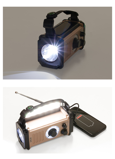 ・ラジオ機能、高輝度LEDの懐中電灯・読書灯、SOSアラート、スマートフォン充電機能など1台5役の多機能ラジオ。