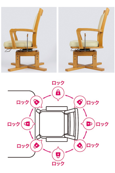 ●サイズ/幅56.5×奥行63×高さ80・84・88cm、座面高:36・40・44cm、ひじ掛け高:55・59・63cm ●重さ/17.5kg ●材質/フレーム:ラバーウッド・アミノアルキド塗装、クッション:ウレタン、張地:合成皮革 ●耐荷重/80kg ●付属品/組立て用六角レンチ、床傷防止用脚裏フェルト ●標準機能/回転機能(45°自動ロック付き)、スライド機能(前後12cm) ●生産国/日本 ●完成品