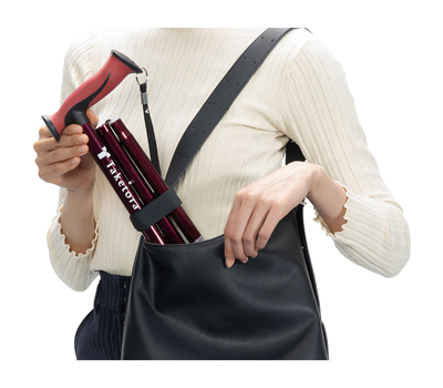 ・持ち運びに便利な折りたたみ杖、手への負担をサポートするワイドグリップ。
