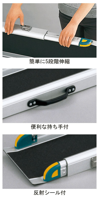 ・走行面にはすべりにくい表面加工。接地面にはズレ防止ゴム。操作が簡単なワンタッチレバー。