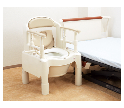 ●サイズ/幅55×奥行55×高さ71〜87cm、座面:幅36×奥行40cm、穴部:幅19×奥行29cm、便座高:33〜49cm(無段階)、ひじ掛け高:18〜30cm(5段階/3cm)、ひじ掛け内寸:38・41cm ●重さ/約10.8kg ●材質/ポリプロピレン、ポリエチレン、ABS樹脂 ●バケツ容量/10L ●最大使用者体重/100kg ●標準機能/ひじ掛け高さ調整、オイルダンパー、防汚トレイ ●生産国/日本 ●抗菌加工 ●要組立