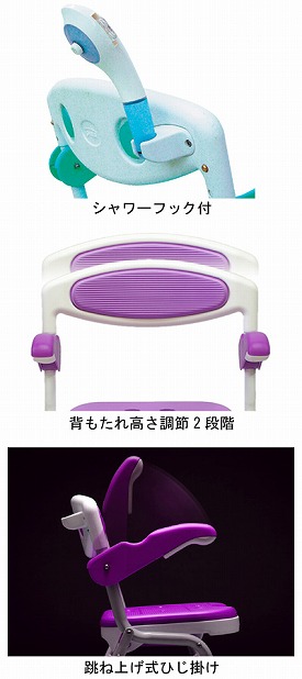 ●サイズ/幅50×奥行45〜52×高さ67.5〜79cm、折りたたみ時:奥行22×高さ76.5〜86.5cm、座面:幅38×奥行32cm、座面高:37〜47cm(5段階/2.5cm)、ひじ掛け高:21cm ●重さ/3.9kg ●材質/座面・背もたれ:ポリエチレン、肘掛け:ポリプロピレン、座面・背もたれパット:EVA、本体:アルミ(粉体塗装)、足ゴム:TPR ●最大使用者体重/100kg ●標準機能/折りたたみ、ひじ掛け跳ね上げ、シャワーフック ●完成品