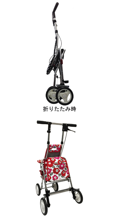 ●サイズ/幅43×奥行54×高さ85〜93(3段階/4cm)cm、折りたたみ時:奥行23×高さ91.5cm、座面:幅25×奥行18cm、座面高:44cm ●車輪サイズ/前輪15×後輪15cm ●重さ/約3.15kg ●材質/フレーム:アルミ、バッグ:ポリエステル ●バッグ容量/約4.5L ●積載荷重/2kg ●最大使用者体重/80kg ●標準機能/折りたたみ、1WAYキャスター(固定)、手元ブレーキ、駐車ブレーキ、座面、杖・傘立て ●生産国/台湾 ●SGマーク取得商品