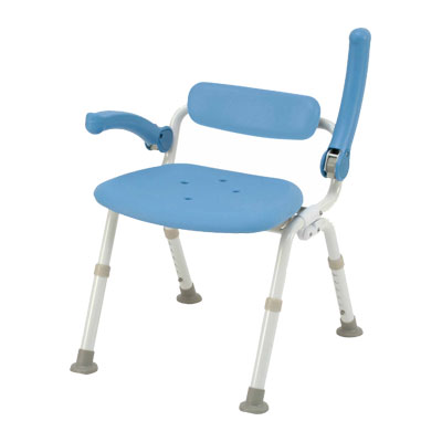 ●サイズ/幅45.5×奥行49〜57.5×高さ52〜62cm、折りたたみ時:奥行20×高さ82〜92cm、座面:幅41.5×奥行31.5cm、座面高:36〜46cm(6段階/2cm)、ひじ掛け内寸:37.5cm ●重さ/4.0kg ●材質/座面・背もたれ・ひじ掛けクッション:EVA樹脂、背もたれ・座面:ポリエチレン、フレーム:アルミ、脚ゴム:EVA樹脂 ●最大使用者体重/100kg ●標準機能/折りたたみ、ひじ掛け跳ね上げ、ソフト座面 ●生産国/中国 ●SIAA防カビ加工 ●完成品