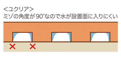 ・ミゾの角度が90°なので水が接地面に入りにくい。