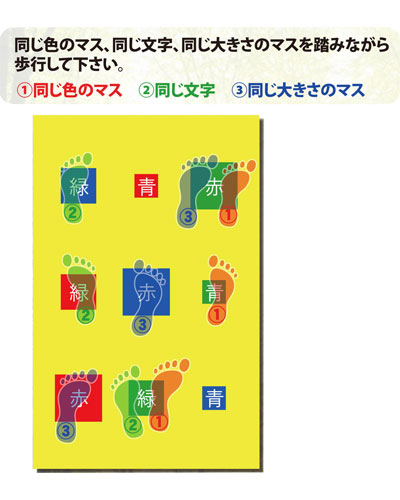 ・同じ色のマス、同じ文字、同じ大きさのマスを踏みながら歩行してください。