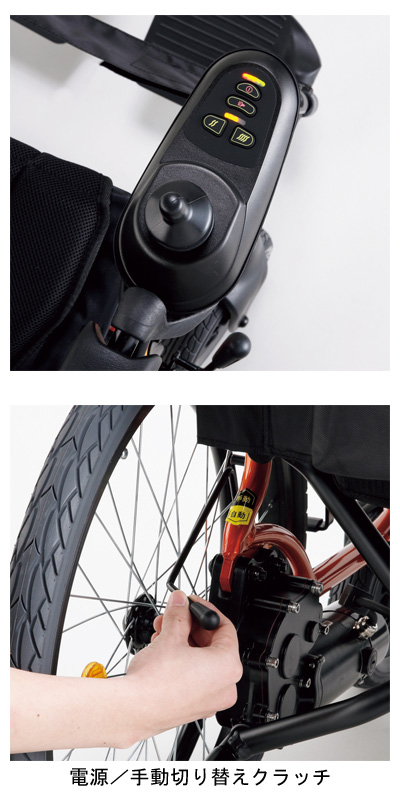 ・左右後輪内側付近にあるクラッチレバーを操作するだけで簡単、確実に電動と手動を切り替えられます。