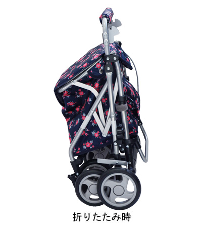 ●サイズ/幅46.5×奥行52×高さ84〜91.5(3段階/4cm)cm、折りたたみ時:奥行28×高さ64cm、座面:幅27×奥行23cm、座面高:48cm ●車輪/前輪13×後輪15cm ●重さ/4.4kg ●材質/フレーム:アルミ(粉体塗装)、バッグ:(ブルー)ビニールレザー・(二筋格子ブルー・フローラルNB)ポリエステル ●バッグ容量/約14L ●積載荷重/10kg ●最大使用者体重/80kg ●標準機能/折りたたみ、2WAYキャスター(左右60°・固定)、手元ブレーキ、駐車ブレーキ、座面、杖・傘立て ●SGマーク取得商品
