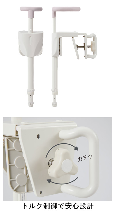 ●サイズ/幅16×奥行25〜34.5×高さ51.5〜78cm、手すり部高さ:13〜18cm(3段階/2.5cm) ●重さ/約4.2kg ●材質/フレーム・脚部:アルミ、グリップ支柱:ステンレス、カバー:ABS樹脂、グリップ表面:熱可塑性エラストマー ●取付可能サイズ/浴槽幅(スペーサーあり):2.5〜13cm、(スペーサーなし):4.5〜15cm ●最大使用者体重/80kg ●生産国/中国 ●SIAA防カビ加工