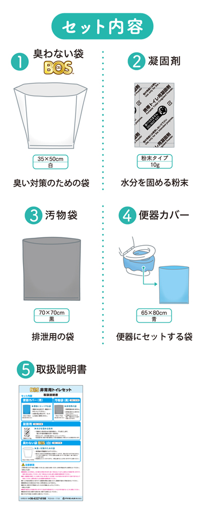 ●セット内容/臭わない袋BOS、凝固剤、汚物袋、便器カバー