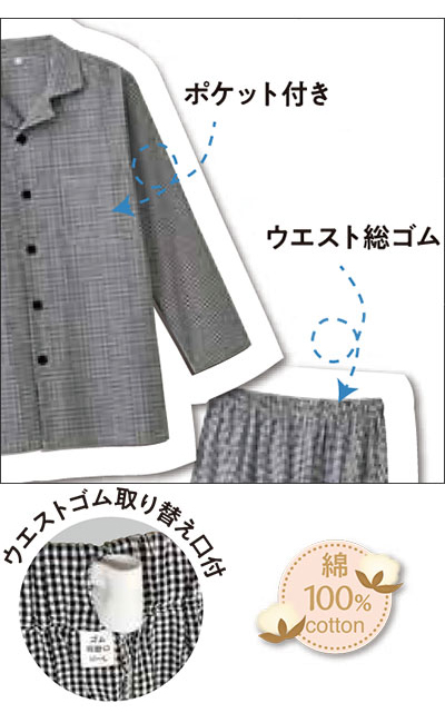 綿100%ギンガムサッカーメンズパジャマ / 041112702 ブラック M-L