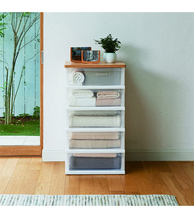 ・木製天板付きのシンプルな多段収納ケースです。引出しストッパー付きで安心してお使いいただけます。