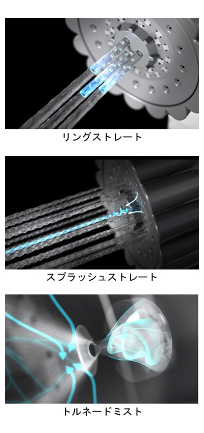・リングストレート:中心部が空洞になった直進性の高い3つの吐水。空洞部で気流を巻き込むことによってウルトラファインバブルを生成します。