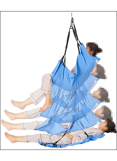 ・簡単動作で吊り上げられるシート型スリング。頭部保持が不要な場合はショートタイプをおすすめ。