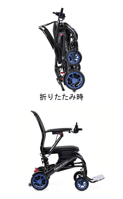 ●サイズ/全幅57×全長92×全高90cm、座面:幅44×奥行42cm、前座高:47cm ●車輪サイズ/前輪16.5×後輪21cm ●重さ/14.5kg(バッテリー除く) ●材質/フレーム:カーボン、シート:ナイロン ●電源/バッテリー ●連続走行距離/約12km ●最高速度前進/6km/h ●実用登坂角度/6° ●最大使用者体重/136kg ●付属品/収納バック、カップホルダー、泥除け、ベルト ●標準機能/折りたたみ(奥行37×高さ78cm)、クッション、ひじ掛け跳ね上げ、ノーパンクタイヤ ●納期/約1〜2ヶ月 ●生産国/中国