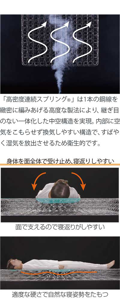 ・マットレスは高密度連続スプリング入り。身体を面全体で受け止め、寝返りしやすい。