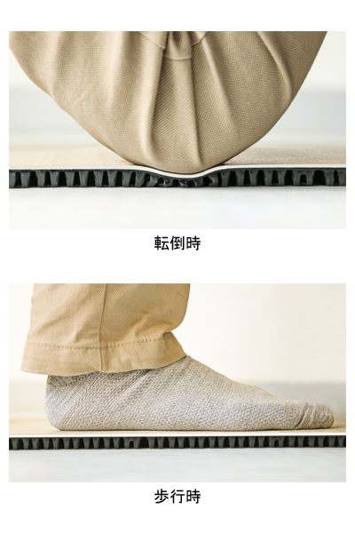 ・「歩行安定性」と「衝撃吸収性」を併せもつ転んだときだけ柔らかい床材。置くだけで転倒骨折リスクを低減。