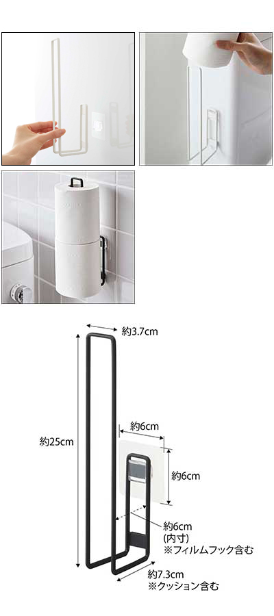 ・トイレットペーパーを差し込むだけの簡単収納。フィルムフックに差し込むだけの簡単設置。