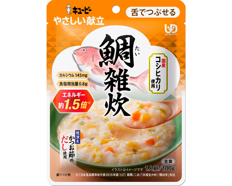●原材料/米(国産)、植物油脂、鶏卵、野菜(にんじん、長ねぎ)、たいだし、でん粉、たい、しょうゆ、かつお節エキス、食塩、かつお節だし、砂糖、野菜エキス、ほたてエキスパウダー、かつお風味調味料/乳化剤、卵殻カルシウム、調味料(アミノ酸等)、カロチノイド色素、ビタミンD、(一部に卵・乳成分・小麦・さば・大豆・鶏肉を含む) ●栄養成分/(1袋当たり)エネルギー111kcal、たんぱく質1.8g、脂質6.8g、炭水化物10.6g、食塩相当量0.8g ●アレルギー/卵・乳成分・小麦・さば・大豆・鶏肉 ●賞味期限/製造後1年7ヶ月 ●ユニバーサルデザインフード/舌でつぶせる(区分3) ●生産国/日本