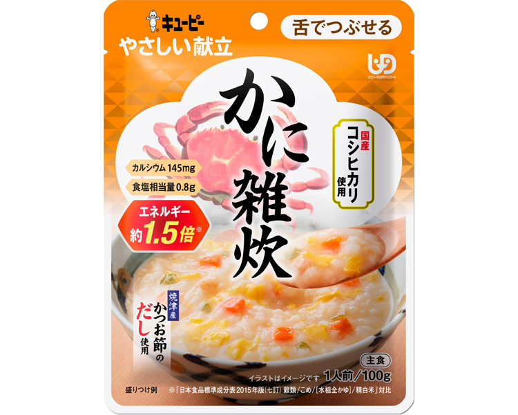 ●原材料/米(国産)、鶏卵、植物油脂、野菜(にんじん、長ねぎ)、かに、しょうゆ、でん粉、かにエキス、砂糖、食塩、かつお節だし、粉末かに殻、かつお節エキス、野菜エキス/乳化剤、卵殻カルシウム、調味料(アミノ酸等)、酸味料、カロチノイド色素、ビタミンD、(一部に卵・小麦・かに・大豆・鶏肉を含む) ●栄養成分/(1袋当たり)エネルギー110kcal、たんぱく質1.8g、脂質6.6g、炭水化物10.8g、食塩相当量0.8g ●アレルギー/卵・小麦・かに・大豆・鶏肉 ●賞味期限/製造後1年7ヶ月 ●ユニバーサルデザインフード/舌でつぶせる(区分3) ●生産国/日本