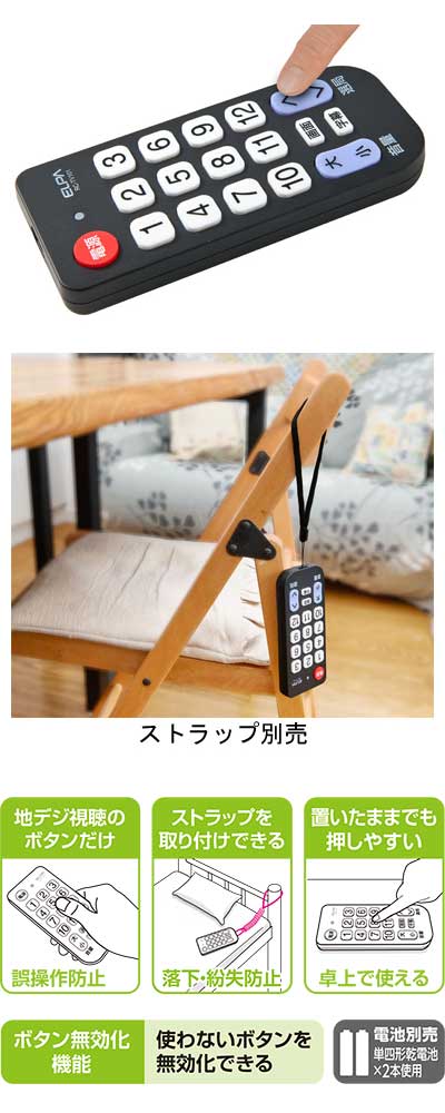・地上波デジタル放送視聴のボタンに絞ったシンプルで使いやすい汎用テレビリモコン。