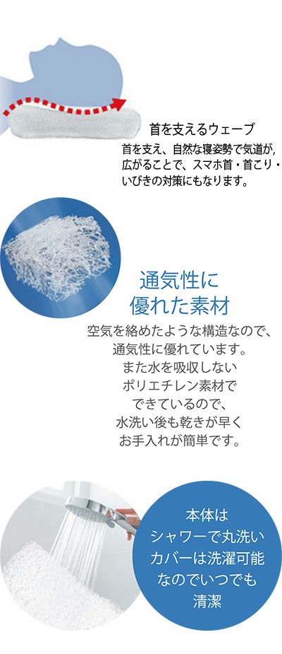 ・首を支えるウェーブ型。首を支え、自然な寝姿勢で軌道が広がることで、スマホ首・首こり・いびきの対策にもなります。